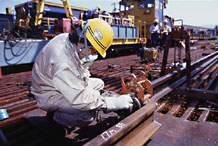 また、緊張ガス圧接ではレール緊張機とガス圧接機を連動させてコンピューターにより軌道上のレール軸力を制御して、レール設定替えを不要にした施工方法です。新幹線、在来線にておおいに活用されています。